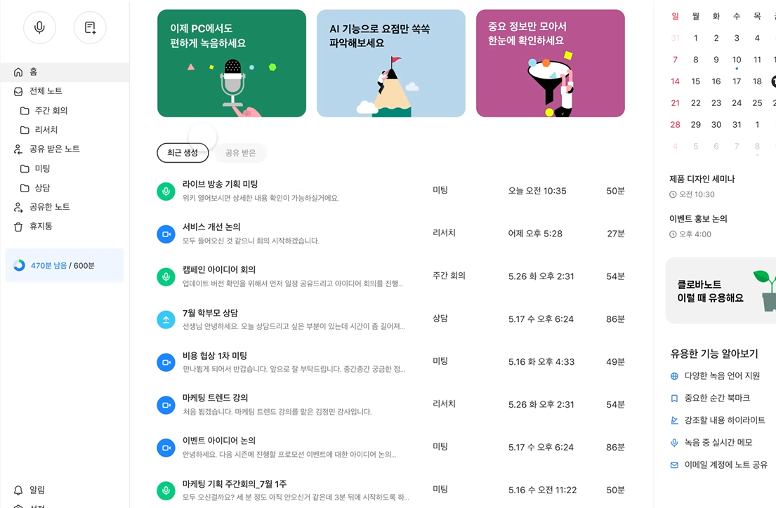 개인적으로 앱보다 웹 버전이 더 편할 때도 있어요. 사무실에서는 PC로 바로 접속해서 녹음하고, 이동 중엔 폰으로 빠르게 확인하고. 특히 ‘새 노트 만들기’ 눌러서 바로 녹음 시작하는 구조라 엄청 직관적이에요.
