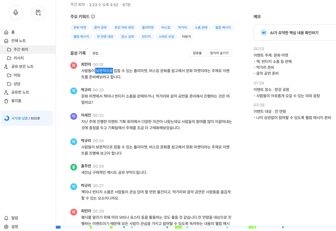 어디서 누가 무슨 얘기를 했는지 다 한눈에 보이니까 일 처리 속도도 빨라지고, 동료들한테 회의록 보내는 시간도 아껴지니까 뿌듯하더라구요.